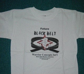 White T-shirt with red and black printing on the full front as shown. Makes a great training T-shirt under a white martial arts uniform or for wear outdoors to show the world your intention to accomplish your goal! Only $15 + $5 shipping and handling